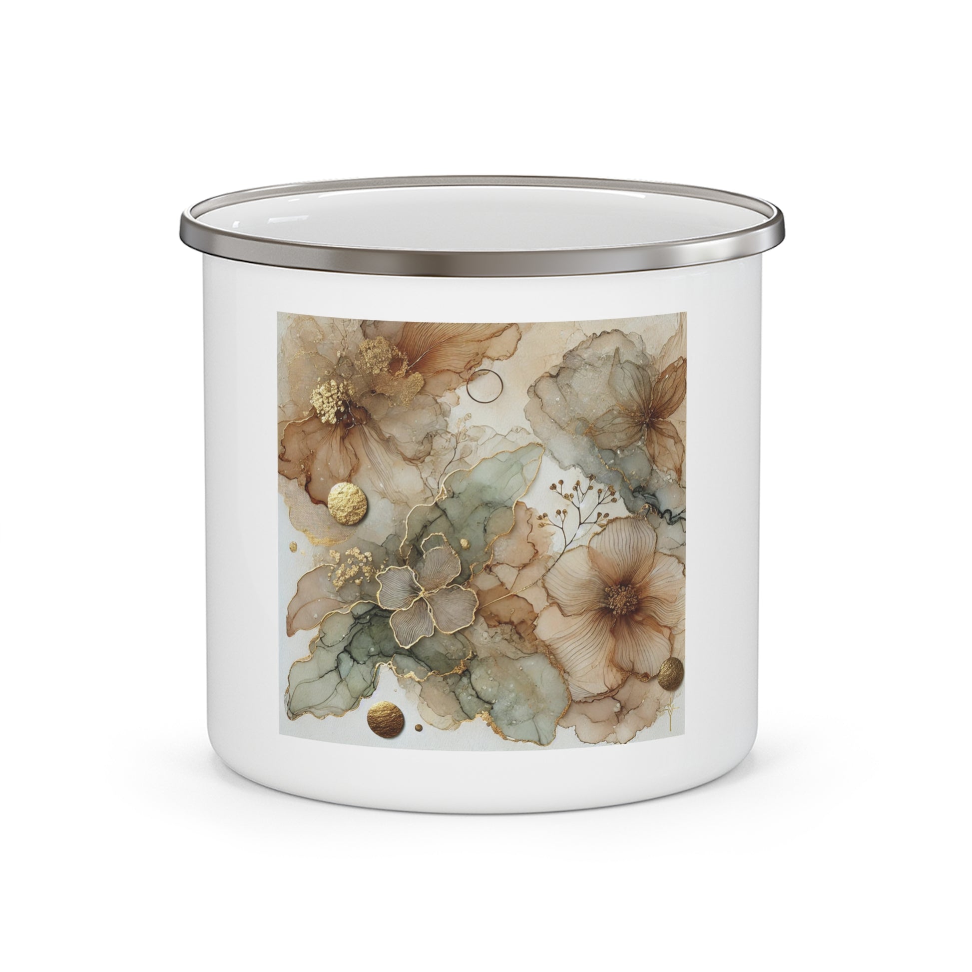 Vibrant enamel outdoor mug featuring beautiful alcohol ink floral art. Perfect for nature lovers and outdoor enthusiasts, this lightweight stainless steel mug is ideal for camping trips or enjoying hot drinks in the garden. Great for Mother's Day, birthdays, and Father's Day gifts.